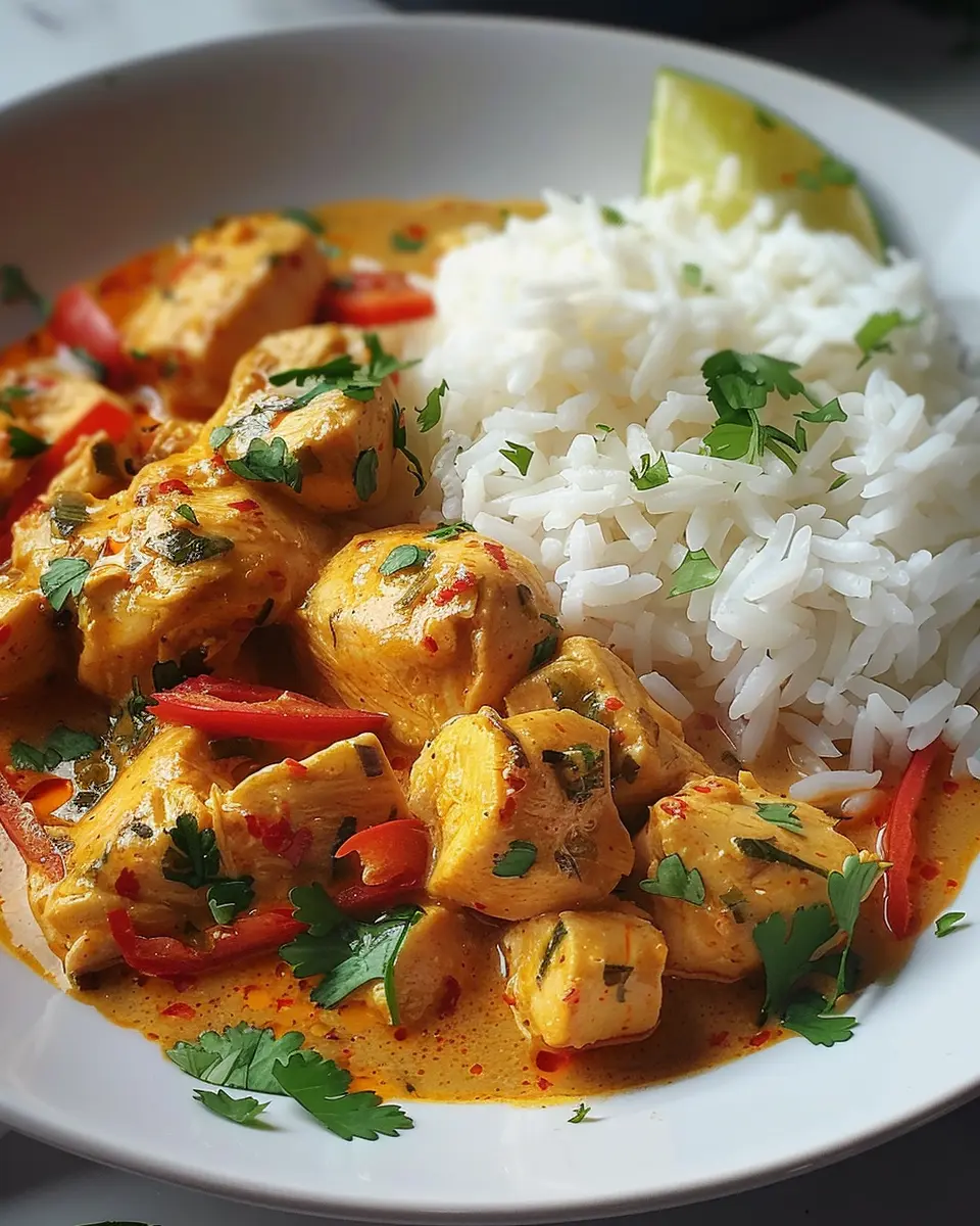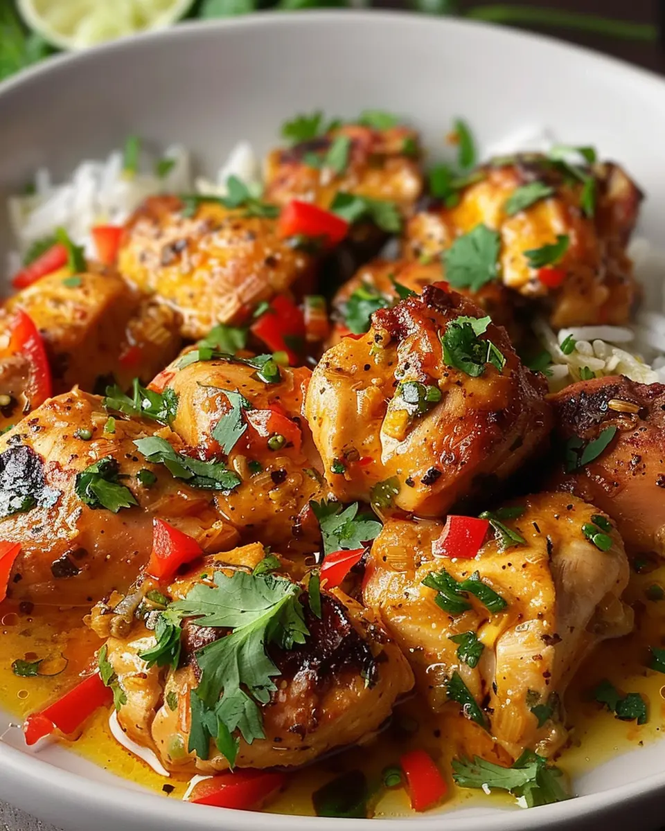 You’ll know it’s ready when the chicken is fully cooked (internal temperature should reach 165°F) and the sauce has thickened slightly. Finish by garnishing with fresh cilantro for brightness. And just like that, your dish is complete!