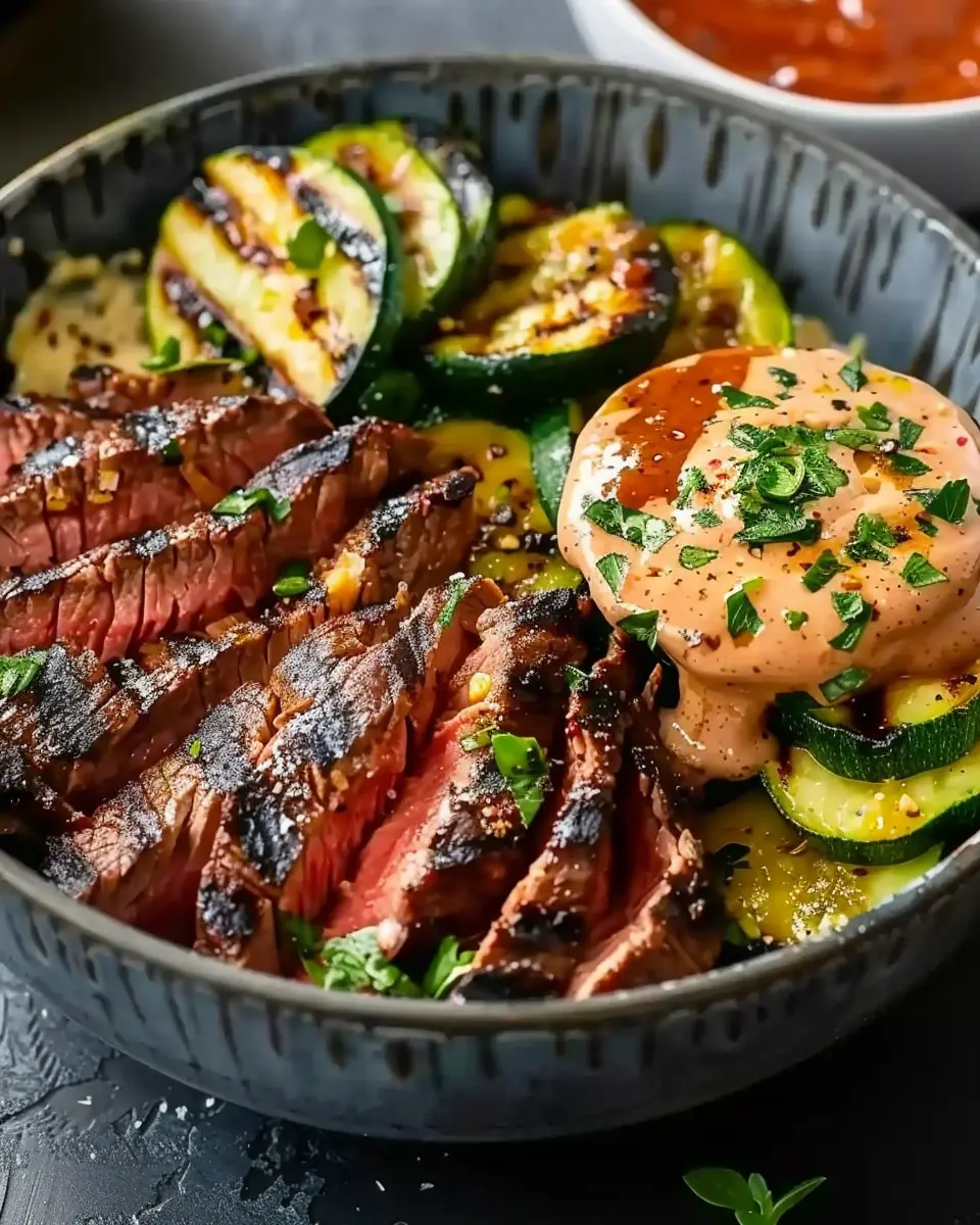 Grilled Steak Bowl: Juicy Recipe with Sauce & Grilled Zucchini