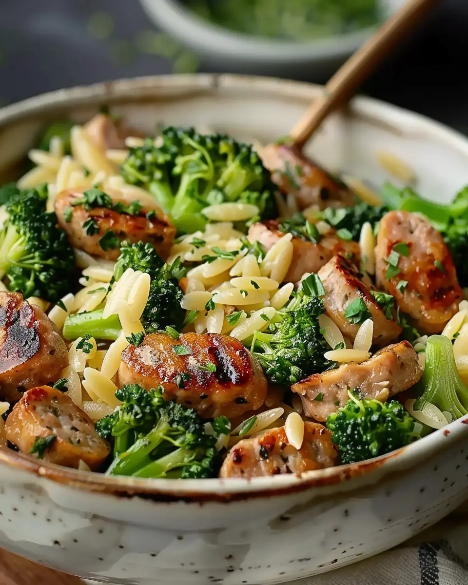 A comforting dish featuring chicken sausage and broccoli mingled with orzo.