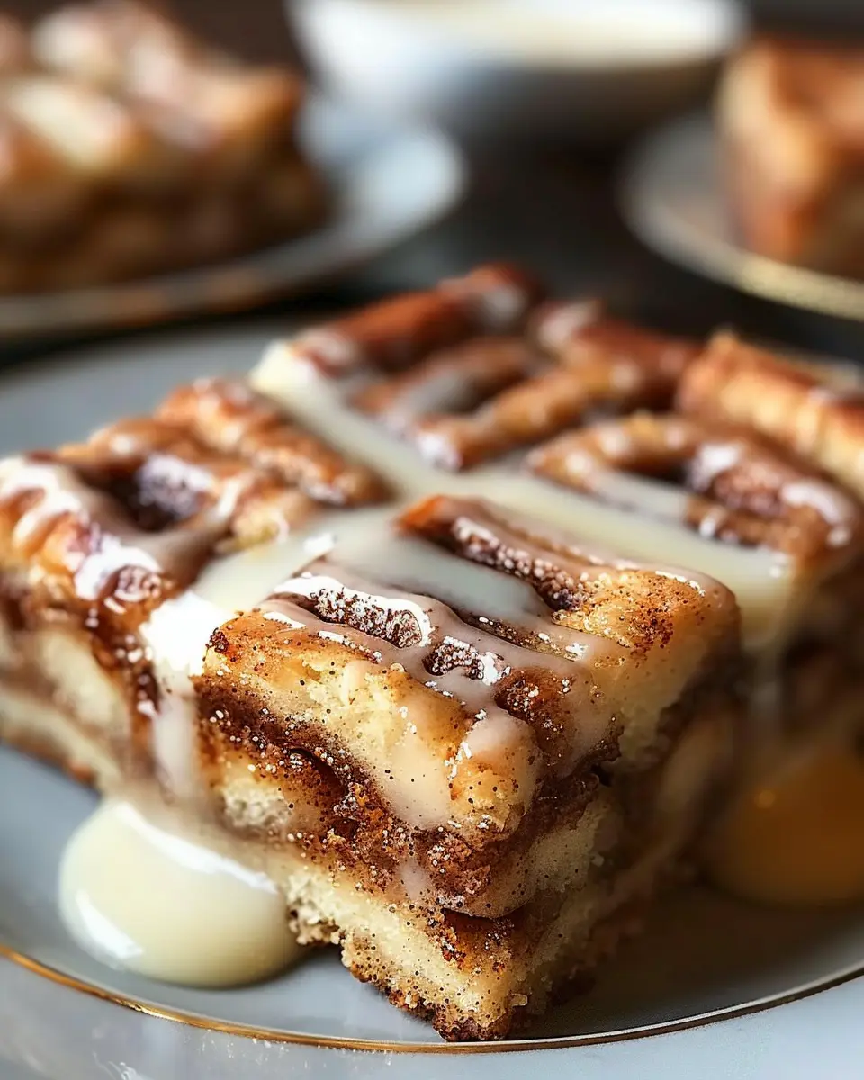 The Soft, Chewy Base: Each bar starts with a buttery, rich dough that hugs the cinnamon and sugar filling just right. Unlike traditional cinnamon rolls, these bars offer a fuss-free way to enjoy that cozy, gooey goodness without the hassle of rolling and slicing dough.