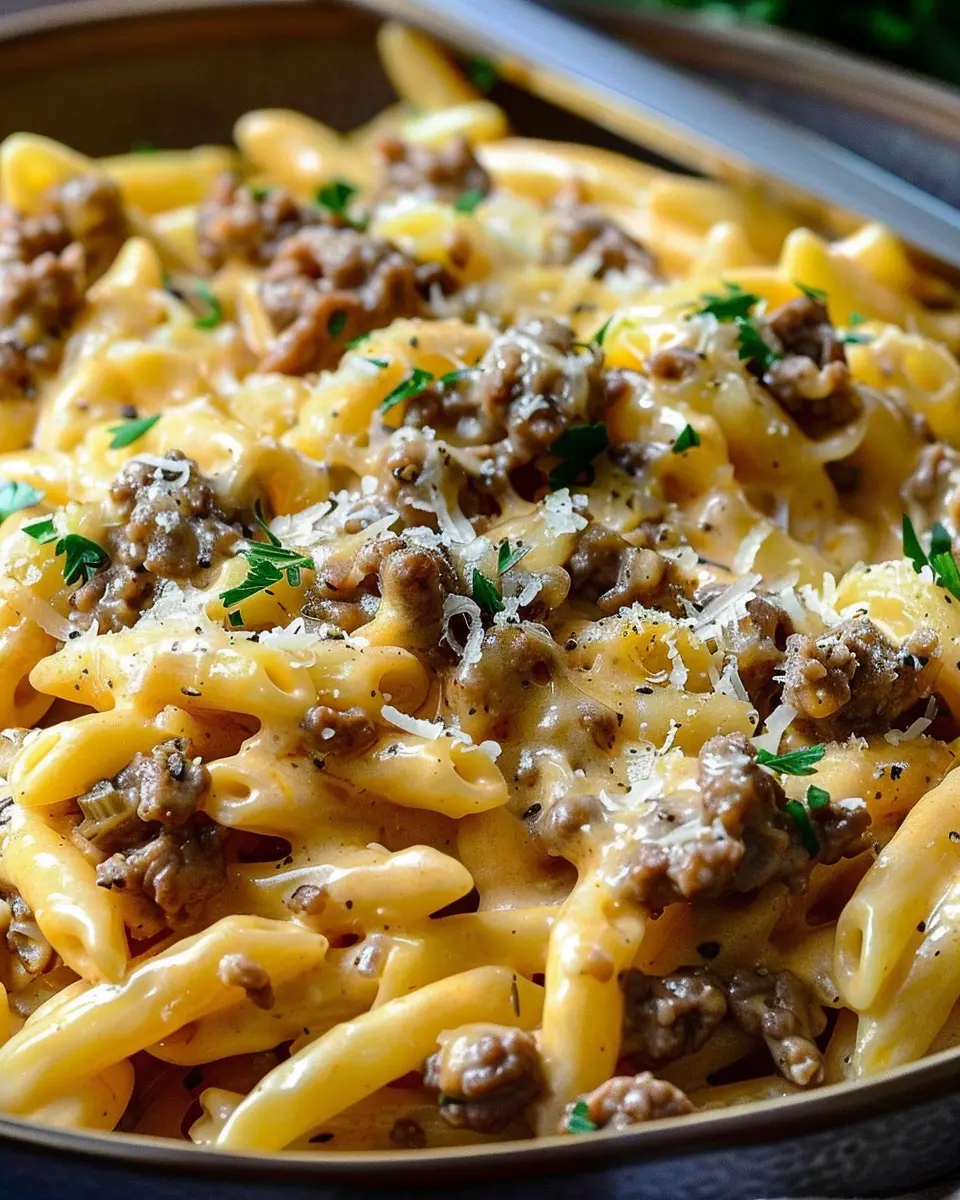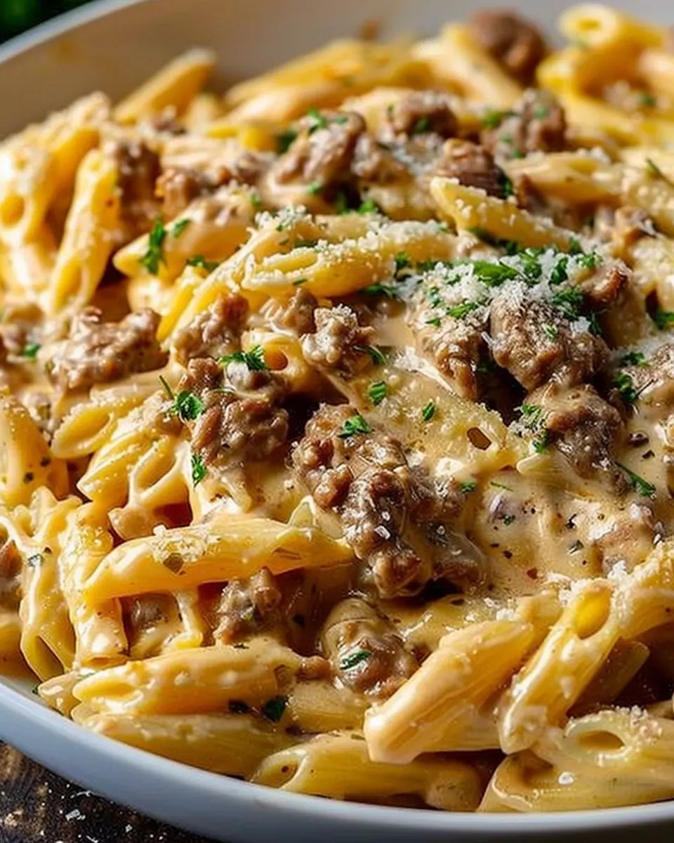 A rich and satisfying pasta dish that combines high protein beef with creamy sauce for a perfect meal.