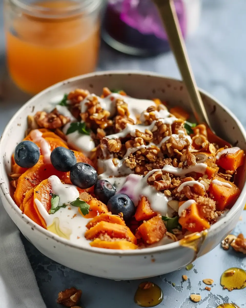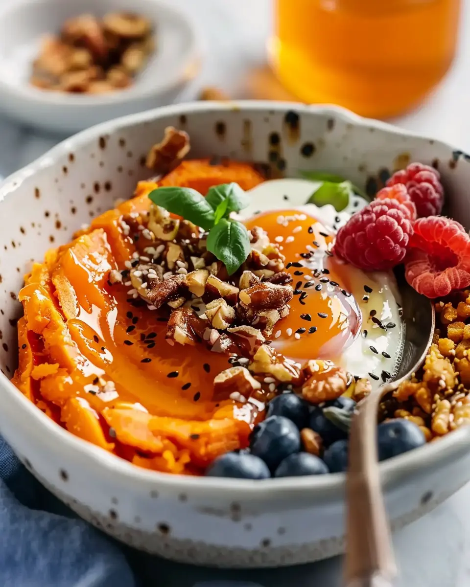 A warm and nourishing breakfast bowl made with sweet potatoes and nutritious toppings, perfect for starting your day on a cozy note.