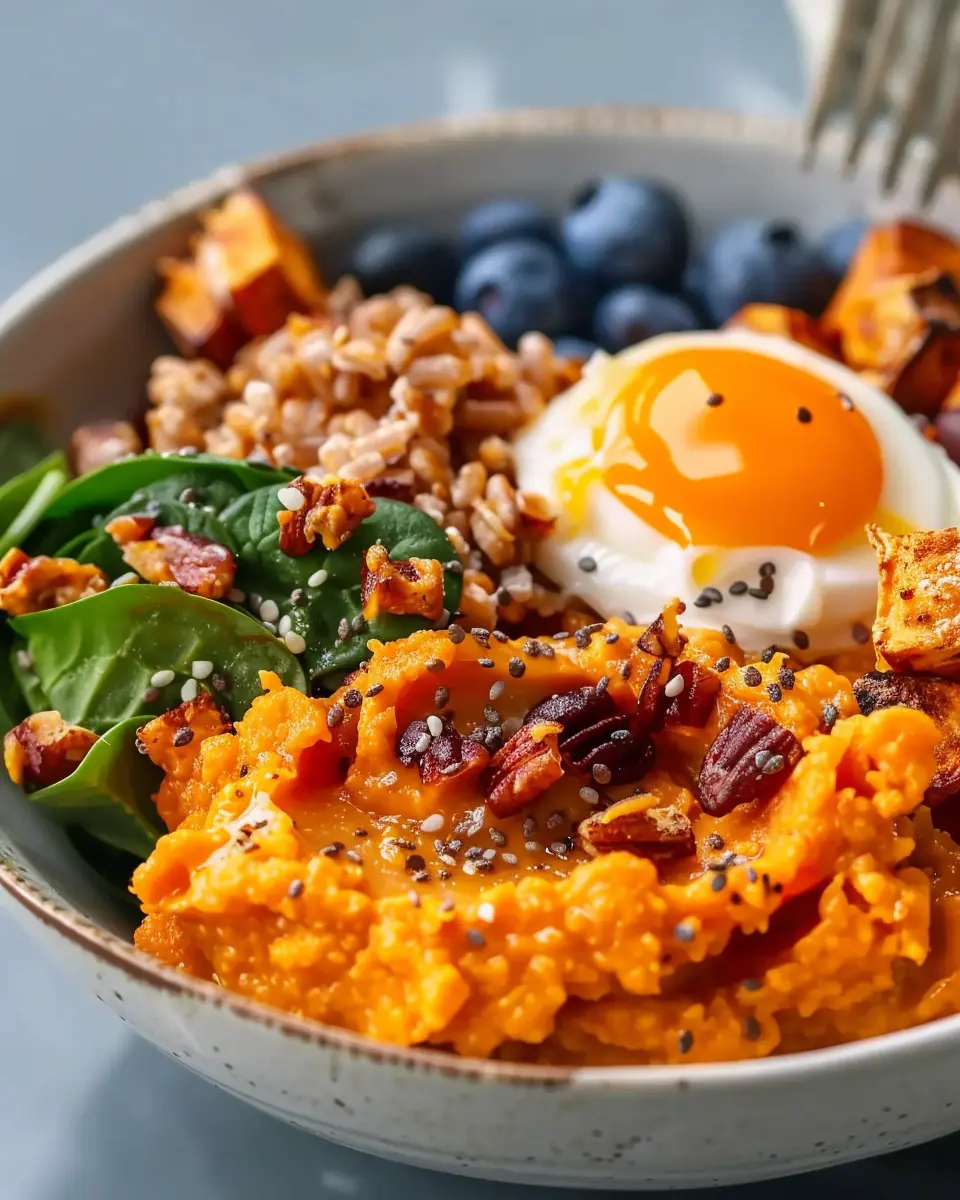 Why not add some seasonal flair? Replacing part of the sweet potatoes with roasted butternut squash brings a delightful sweetness and adds a beautiful color to your bowl. Just cube the butternut squash, toss it in olive oil, salt, and pepper, and roast until tender. The earthy flavor of the squash pairs perfectly with the sweet potatoes, creating a nutrient-packed breakfast that’s as appealing to the eye as it is to the palate.