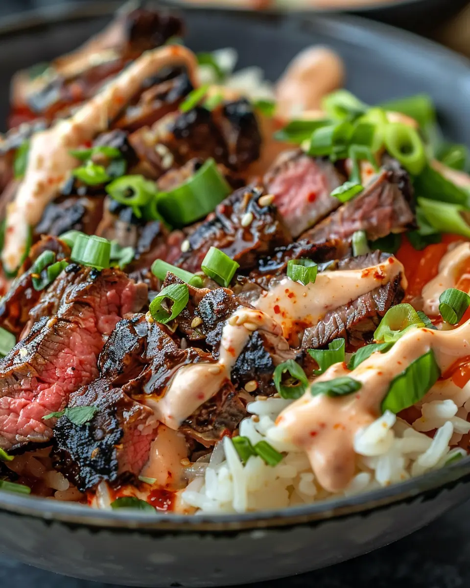 A delicious recipe for Korean BBQ Steak Rice Bowls served with a spicy cream sauce.