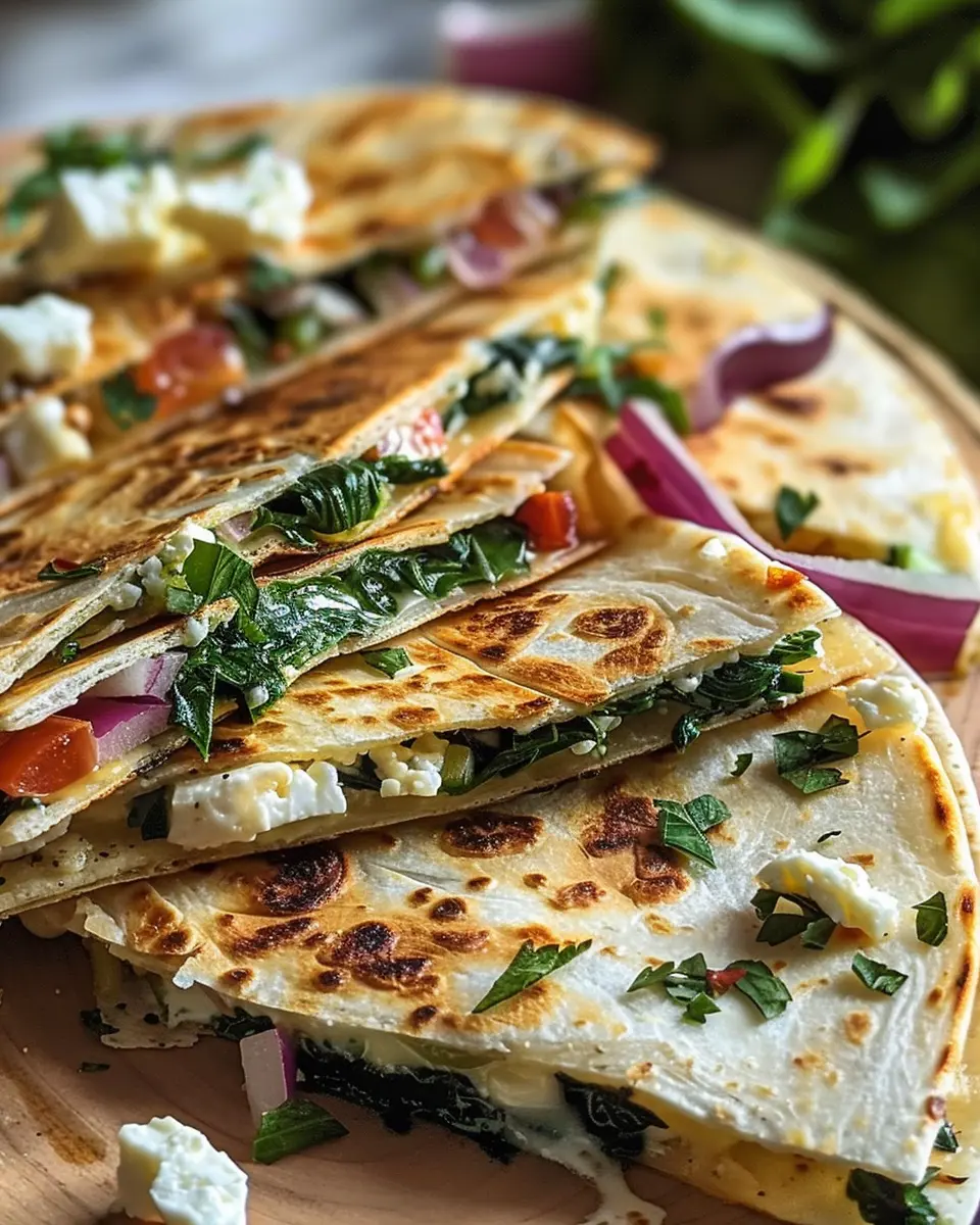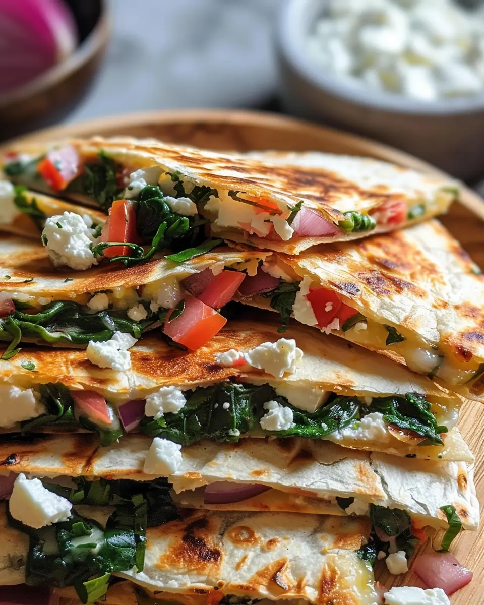Delight in these Mediterranean quesadillas packed with fresh spinach, creamy feta, and gooey mozzarella, all harmonized with the sweetness of red onion.
